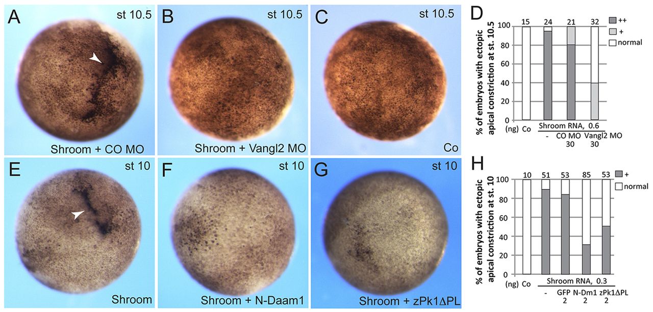 Fig. 4. Interference with the PCP pathway prevents Shroom-induced apical constriction. Early embryos were animally injected with FLAG-Shroom RNA (50â pg) and other RNAs or MOs as indicated. (A-D) Vangl2 depletion inhibits Shroom-dependent ectopic apical constriction (arrowhead). CO, control. (A-C) Representative embryo images at stage (st) 10.5. (D) Quantification of the data, numbers of embryos with strong, mild and no ectopic constriction are presented. Strong (++) apical constriction involves hyperpigmentation and the accompanying tissue invagination, mild (+) constriction is frequently visible as diffuse hyperpigmentation in the absence of tissue indentation. (E-H) Inhibitory effects of N-Daam1 and zPk1δPL on Shroom-dependent apical constriction in stage 10 embryos. (H) Quantification of the data. +indicates ectopic apical constriction; ânormalâ indicates no constriction. |
