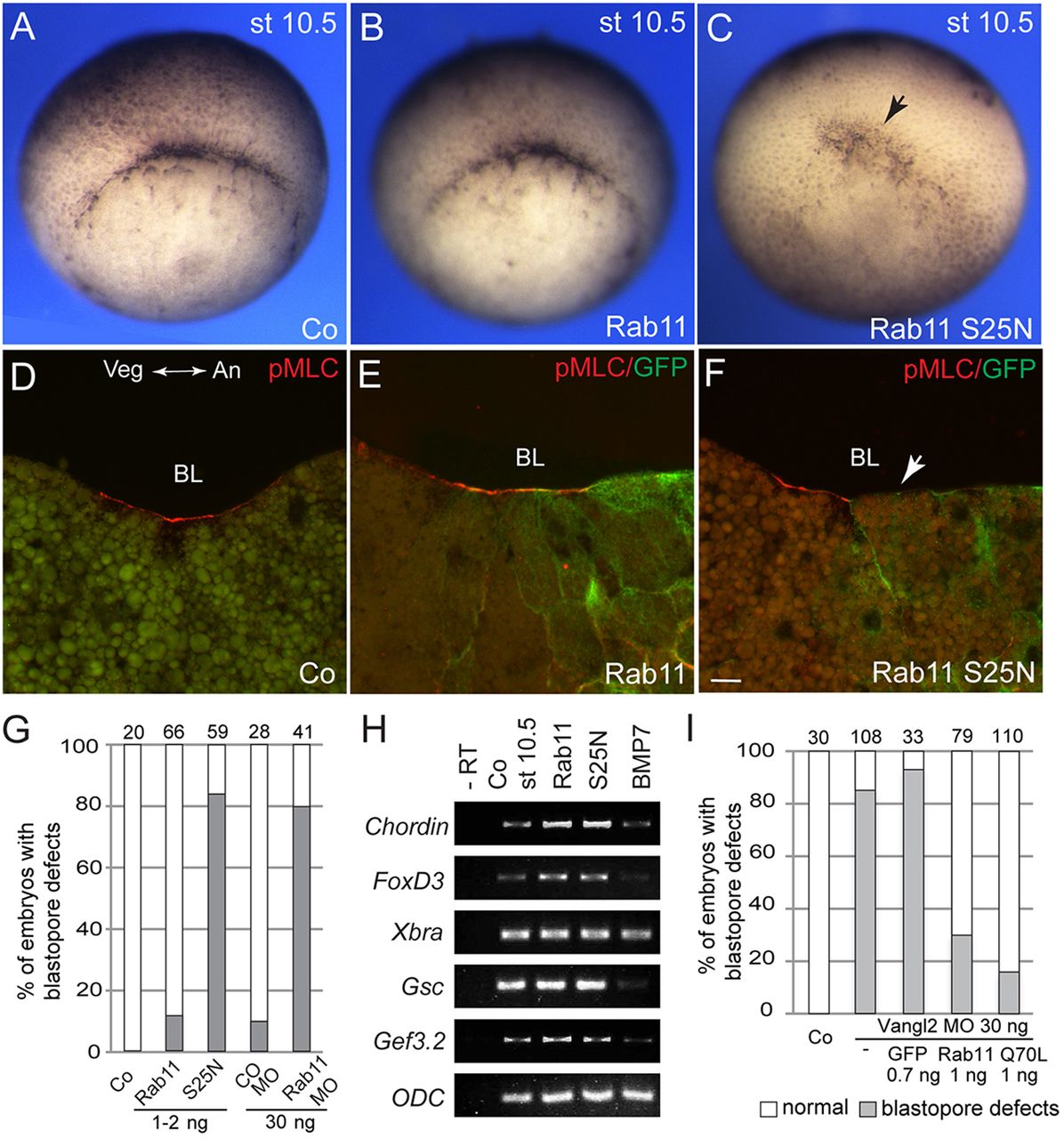 Fig. 6. The involvement of Rab11 in blastopore formation and myosin II activation. (A-F) Embryos were co-injected with RNAs encoding wild-type Rab11 or Rab11S25N and GFP RNA as a lineage tracer. Alternatively, Rab11 was depleted with a specific Rab11 MO. Co, control. (A-C) En face view of the injected embryo morphology at stage (st) 10.5. The arrow points to the inhibited blastopore lip. (D-F) Inhibition of pMLC staining in Rab11S25N-expressing embryos. A cross-section is shown with animal pole to the right. The arrow shows lack of the pMLC signal. BL, blastopore lip; Veg, vegetal; An, animal. Scale bar: 20â µm. (G) Quantification of the results. The total number of embryos per group is shown at the top of each column. (H) Mesendodermal marker expression in embryos (stage 10.5) with manipulated Rab11 function. (I) Rab11 rescues blastopore formation in Vangl2-depleted embryos. Both dorsal blastomeres of four-cell embryos were injected with 30â ng of Vangl2 MO and 1â ng of RNA encoding wild-type Rab11, Rab11Q70L or GFP. Data are shown as the frequency of embryos with dorsal lip defects scored at stage 10+. |