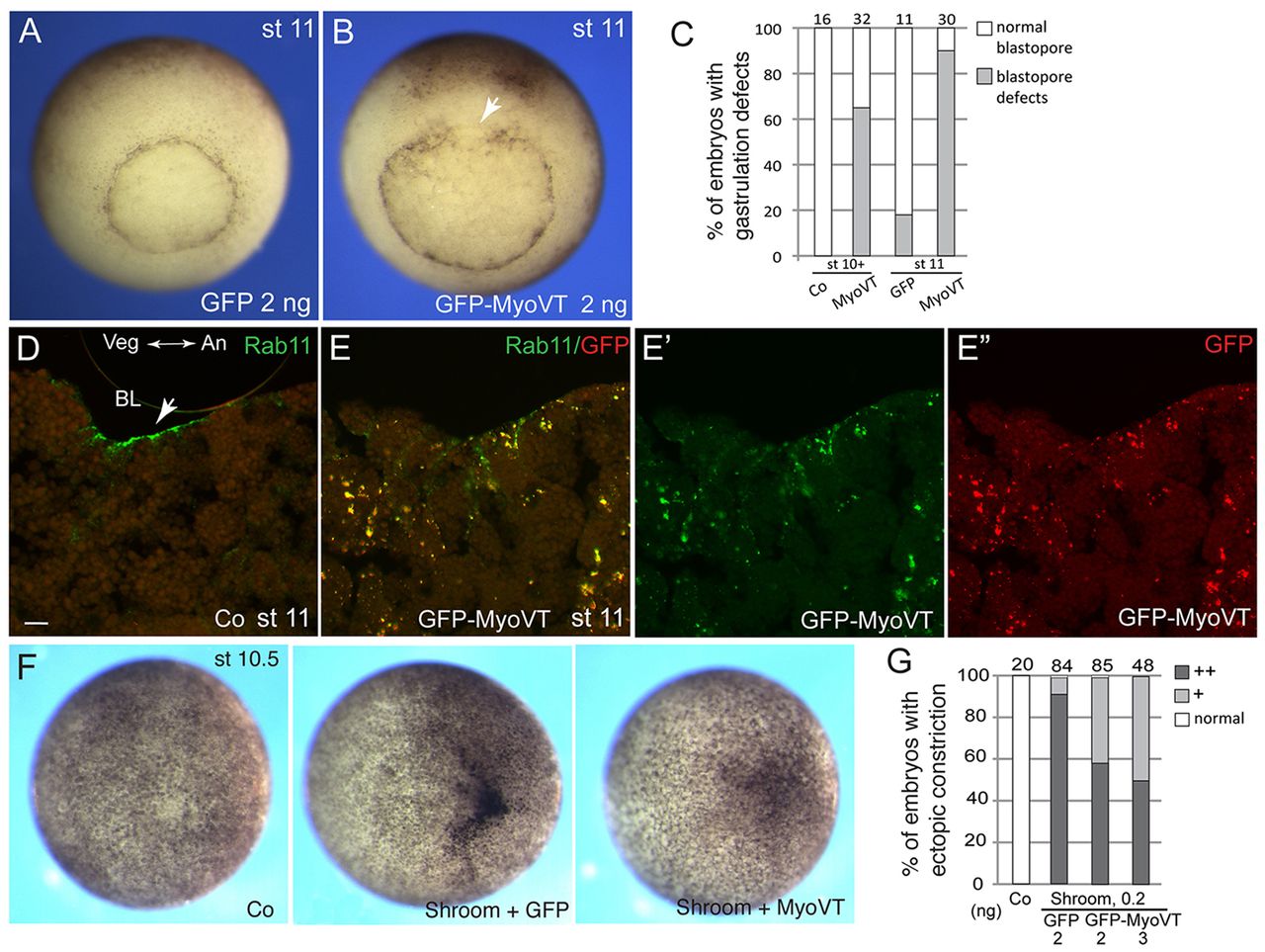 Fig. 7. Myosin V regulates endogenous and Shroom-mediated apical constriction. (A-C) Early embryos were injected with 2â ng of RNAs encoding GFP (A) or the carboxy-terminal tail of Myosin V fused to GFP (GFP-MyoVT, B). Blastopore defects of stage (st) 11 MyoVT embryos (B), as compared with the control (A) are shown. (C) Quantification of the results at the early and late gastrula stages. Co, control. (D,E) GFP-MyoVT alters the normal pattern of Rab11 distribution. BL, blastopore lip. (D) Transverse section of a stage 11 blastopore, stained for endogenous Rab11. The animal-vegetal (An-Vg) axis is indicated. Arrow points to Rab11 staining in bottle cells. Scale bar: 20â µm. (E,Eâ²) Transverse section of a stage 11 defective blastopore from a MyoVT-expressing embryo. MyoVT forms cytoplasmic aggregates that colocalize with endogenous Rab11 protein. (F,G) GFP-MyoVT interferes with Shroom-mediated constriction. Scoring was carried out for embryos with strong (++) and mild (+) ectopic constriction. |