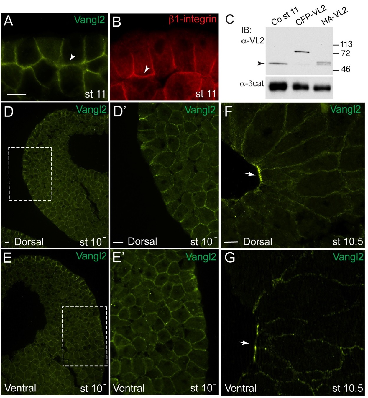 Fig. S1. Immunodetection of endogenous Vangl2 protein. (A, B) Basolateral localization (arrowhead) of Vangl2 (A) and b1-integrin (B) in embryonic ectoderm at stage 11. (C) Immunoblot of ectodermal cell lysates with anti- Vangl2 antibody reveals a 60 kDa band (arrowhead) corresponding to endogenous Vangl2, misexpressed Xenopus CFP-Vangl2 and mouse HA-VL2, as indicated.(D-G) Vangl2 immunostaining on cross-sections of st. 10- and st. 10.5 embryos. Dashed boxes in D and E correspond to the magnified images shown in Dâ and Eâ. Vangl2 is detected at the basolateral membrane and in cytoplasmic vesicles near the apical cortex, and appears more abundant in the superficial cell layer. Scale bar in A is 20 μm. Both apical (arrow) and basolateral staining is detected in the constricting blastopore cells of st. 10.5 embryo. D-G, Scale bar is 20 μm. |