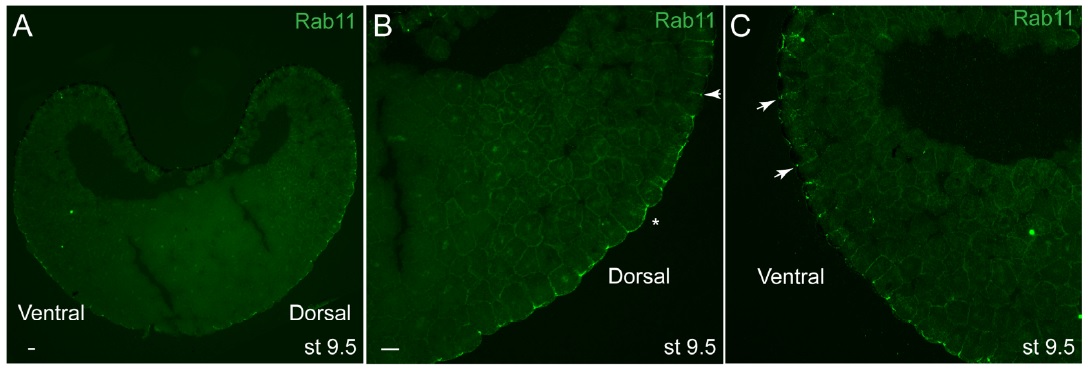 Fig. S3. Rab11 subcellular localization before gastrulation. (A-C) Cross-sections of late blastula embryos (n=10) stained for endogenous Rab11. A, Representative embryo at stage 9.5 is shown, B, Dorsal marginal zone area reveals enriched apical (asterisk) and apical junctional (arrowhead) staining. C, Rab11 is mostly at the junctions (arrowheads) in the ventral marginal zone. Scale bar is 20 μm in all panels. |