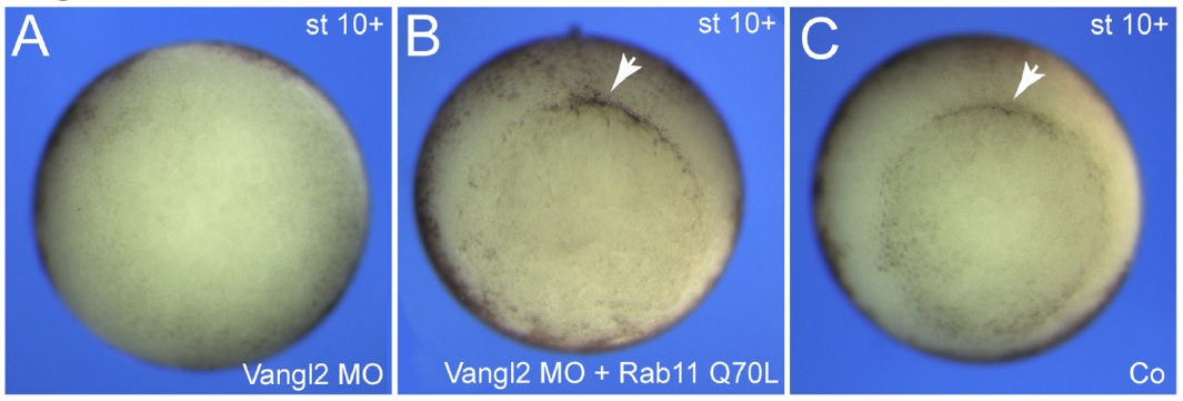 Fig. S4. Rescue of dorsal blastopore in Vangl2-depleted embryos by Rab11 RNA. (A, B) Embryos were injected with 30 ng of Vangl2 MO and 1 ng of Rab11Q70L RNA as indicated. (C) Uninjected control embryo. Vegetal views reveal the comparative morphology of the dorsal lip (arrow) for representative embryos from data in Fig. 6I. |