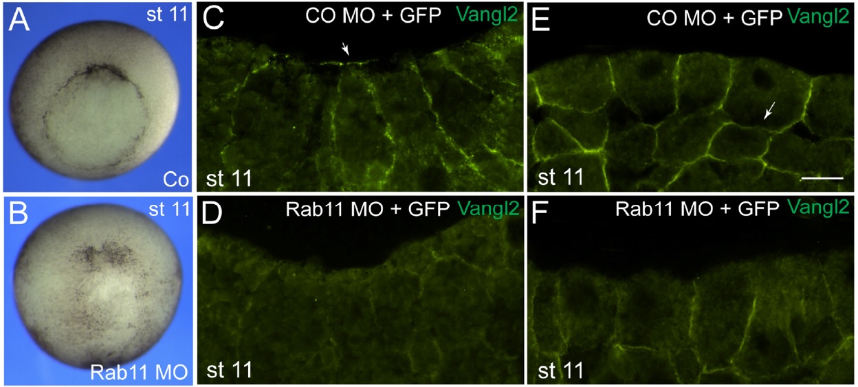 Fig. S5. Vangl2 is dissociated from the cell membrane in Rab11-depleted embryos. Embryos were coinjected with CO MO or Vangl2 MO (30 ng each) and 100 pg of GFP RNA as lineage tracer (not shown). A, B, Morphology of control (A) and Rab11-depleted (B) embryos at st. 11, vegetal views are shown. C, D, Rab11 depletion interferes with the membrane localization of Vangl2, including the apical surface of the constricting blastopore cells (arrow). E, F, Basolateral membrane localization of Vangl2 is inhibited in ectoderm cells depleted of Rab11. Scale bar in E, also refers to C, D and F, is 20 μm. |
