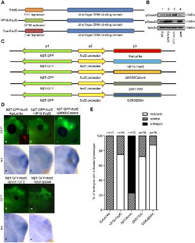Fig. 3. The Fezf2-regulated endogenous level of Wnt/β-catenin signalling governs forebrain neurogenesis. (A) Different Fezf2 constructs. Different N-terminal domains (Eh1-repressor, VP16 activator or Eve repressor) are shown in different colours. The zinc-finger DNA-binding domain is shown in blue. (B) Western blot of gastrula stage Xenopus embryos injected with nuclear lacZ (control), eve-fezf2, VP16-fezf2 and wt-fezf2 and assayed for phosphorylated Smad1 or Smad2 and α-Tubulin (loading control). (C) pTransgenesis system transgenic constructs to assess the impact of Fezf2 and/or Wnt activities on forebrain development. (D) Expression of NβT-GFP (a-e, stage 40 embryo) and arx (aâ²-eâ², stage 30 embryo) in the forebrain of transgenic embryos harbouring the transgenes shown in C. Inset (a) shows the fluorescence from Katushka (red). (E) Quantification of neural tissue growth phenotypes from D. |