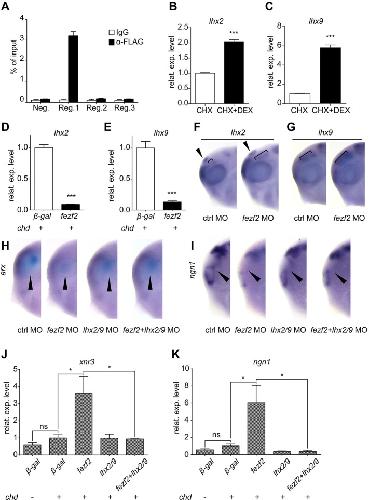 Fig. 5. Fezf2 represses the activity of lhx2 and lhx9 in the forebrain. (A) ChIP-qPCR analysis of Fezf2 binding to the lhx2 promoter. Region 1 showed very high enrichment (n=3 replicates). (B,C) qPCR analysis of lhx2 and lhx9 expression in p3hGR-VP16-Fezf2-injected animal cap explants aged to stage 12 and treated with CHX alone or CHX+DEX (n=3 replicates). (D,E) qPCR analysis of lhx2 and lhx9 expression in neuralised animal cap explants aged to stage 20 (n=3 replicates). (F,G) In situ hybridisation analysis shows that mild knockdown of fezf2 leads to expansion of the lhx2 (F) and lhx9 (G) expression area. Arrowhead indicates the epithalamus; bracket indicates the ventral diencephalon. (H,I) In situ hybridisation analysis of arx (H) or ngn1 (I) in stage 28 morphants (lateral views). Arrowheads indicate arx or ngn1 expression. (J) qPCR analysis shows that lhx2 and lhx9 antagonise expression of the fezf2-induced Wnt-responsive gene xnr3 in stage 14 animal cap explants (n=3 replicates). (K) qPCR analysis shows lhx2 and lhx9 antagonise fezf2-induced ngn1 expression in stage 20 animal cap explants (n=3 replicates). In all qPCR analyses, rpl8 was used as internal control. Error bars represent s.e.m. *P<0.05, ***P<0.001; ns, not significant. |
