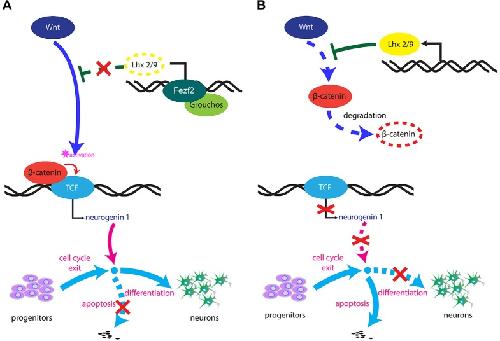 Fig. 6. Mechanistic model of Fezf2 function in the forebrain. (A) In the presence of Fezf2. Fezf2 interacts with Groucho-family repressors and inhibits the expression of lhx2/lhx9. Consequently, β-catenin binds to the Tcf complex and Wnt signalling is activated, promoting the expression of neurogenin 1 and thus stimulating neuronal differentiation. (B) In the absence of Fezf2. Lhx2/Lhx9 inhibits Wnt signalling, resulting in the degradation of β-catenin. In the absence of β-catenin, the Tcf complex is maintained in a repressive state. This repressive Tcf complex inhibits neurogenin 1 expression, thus inhibiting neurogenesis. Progenitor cells that have exited the proliferation state cannot differentiate and thus enter apoptosis. |