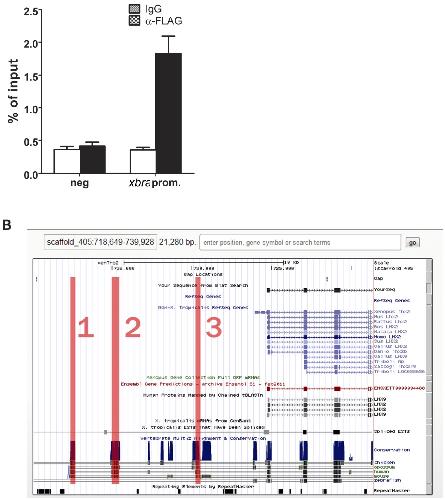 Figure S7 (related to Figure 5). Demonstration of ChIP-qPCR efficiency and Fezf2 binding site. (A) ChIP-qPCR result of FLAG-tagged FoxH1 using IgG (control) or anti-FLAG antibody, showing enrichment in the proximity of branchyury (xbra) promoter. (B) Schematics of the three highly conserved regions screened by ChIPqPCR, highlighted areas have been screened using primers designed against each of the different regions. |