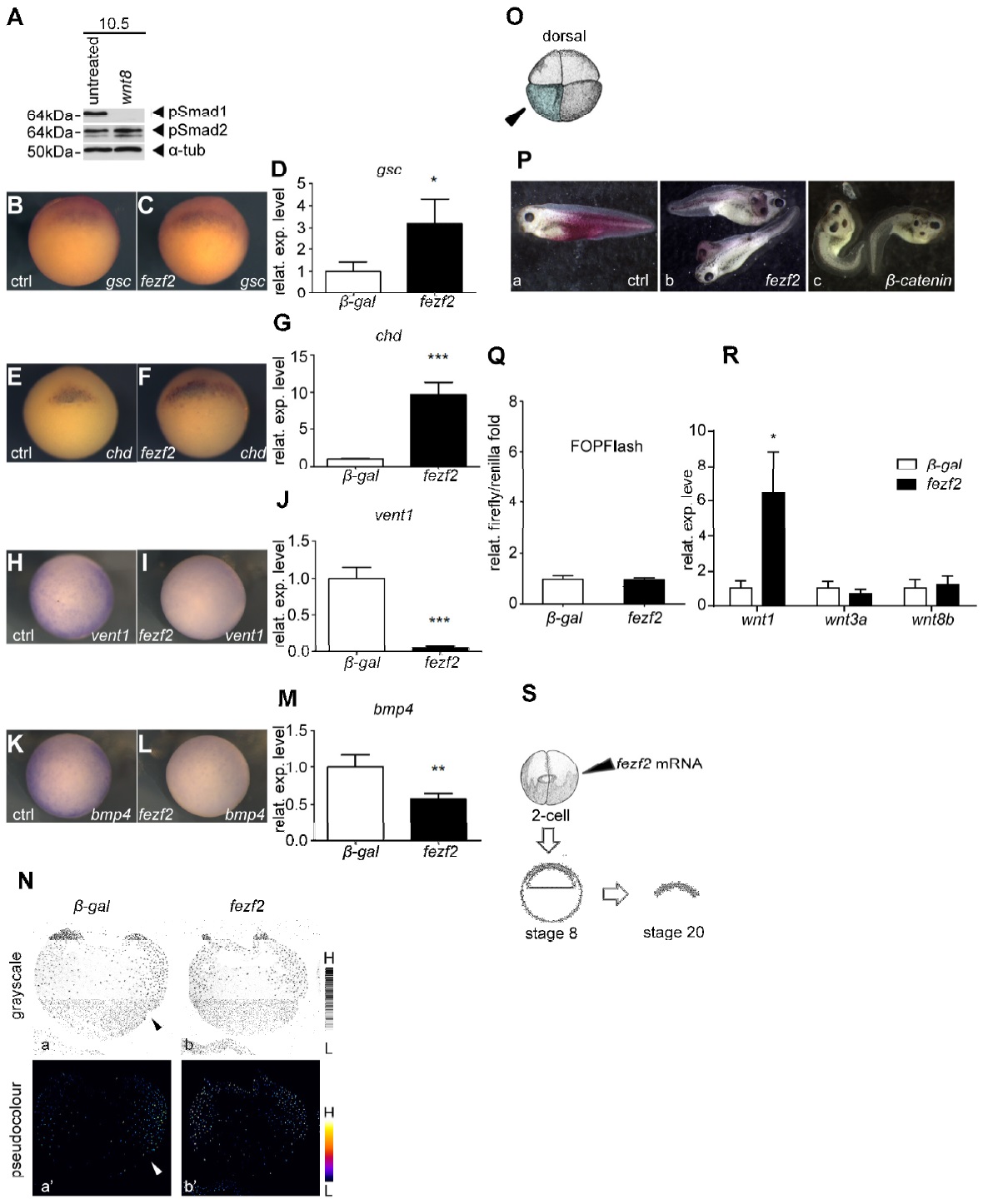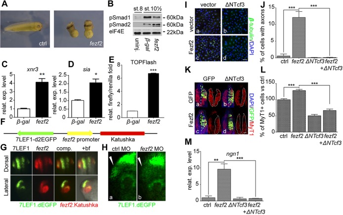 Fig. 2. fezf2 promotes Wnt/β-catenin signalling and induces neuronal differentiation through Wnt/β-catenin in vitro and in vivo. (A) fezf2 misexpression in early Xenopus embryos leads to strong dorsoanteriorisation (31/35 embryos examined showed the illustrated phenotype) compared with lacZ (β-gal) controls (39/39). (B) fezf2 misexpression enhances Smad2/3 phosphorylation and inhibits Smad1/5/8 phosphorylation as assessed in western blots. Blastula stage (st. 8) indicates the pre-activation state. Elongation factor 4E (elF4E) was used as a loading control. (C,D) qPCR shows that fezf2 promotes the expression of xnr3 (C) and sia (D) in early embryos (n=3 replicates). (E) TOPFlash assay shows that fezf2 promotes Wnt/β-catenin signalling (n=4 replicates). (F-H) fezf2 expression colocalises with active Wnt signalling in the forebrain. (F) The transgenic construct. (G) Dorsal and lateral views of stage 30 embryos; GFP signal for Wnt activity (green); Katushka signal for fezf2 expression (red); +bf, merged image with bright-field. (H) Knockdown of fezf2 reduces Wnt activity in the forebrain as assessed by expression of the 7LEF-dEGFP F1.1 Wnt reporter line. Arrowhead indicates the diencephalon. (I) The Wnt inhibitor δNTcf3 antagonises Fezf2-induced neuronal differentiation in mouse neuronal progenitors, as assessed by the induction of axonogenesis. (J) Statistics of I (n=4 replicates). (K,L) Electroporation experiments show that the Wnt inhibitor δNTcf3 antagonises Fezf2-induced neuronal differentiation in the tadpole forebrain. (K) Transverse sections of the forebrain area of stage 30 embryos electroporated correspondingly and stained for MyT1 (red), GFP (green) and with DAPI (blue). Left images, merge; right images, MyT1 alone. (L) Statistics of K (n=5 embryos). Control side is normalised to 100%. (M) qPCR analysis shows that the Wnt inhibitor δNTcf3 antagonises Fezf2-induced ngn1 expression in stage 20 animal cap explants (n=3 replicates). In all qPCR analyses, ribosomal protein L8 (rpl8) was used as an internal control. *P<0.05, **P<0.01, ***P<0.001. Error bars represent s.e.m. Scale bars: 100â µm in I; 50â µm in K. |