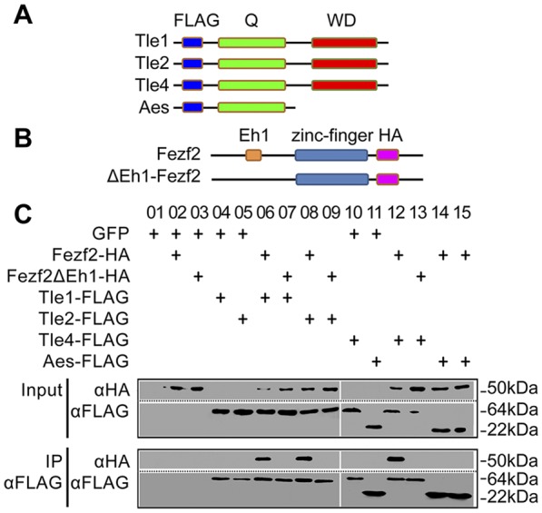 Fig. 4. Fezf2 functions through interaction with members of Groucho family. (A) Tle1, Tle2, Tle4 and Aes constructs. Note that Aes lacks the protein-interaction WD domain. (B) Wild-type Fezf2 and δEh1-Fezf2 with a mutated Eh1 domain. (C) Immunoprecipitation of extracts from Xenopus embryos injected with different combinations of the indicated mRNAs, showing that Fezf2 interacts with Tle1, Tle2 and Tle4 (lanes 6, 8 and 12) but not Aes (lanes 14, 15). The Eh1 domain is required for the proper interaction between Fezf2 and Tle1/2/4 (lanes 6 and 7, 8 and 9, 12 and 13). |