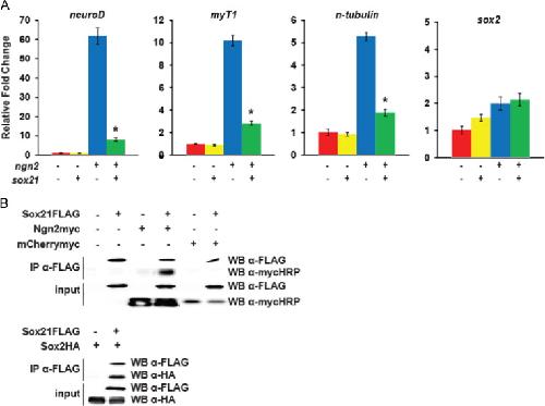 Fig. 4. Sox21 inhibits the expression of neuronal differentiation genes and binds to Ngn2 to counteract its function. (A) Quantitative RT-PCR analysis of neuroD, myT1, n-tubulin and sox2 expression in neurula stage ectodermal explants isolated from embryos injected with ngn2, sox21, or ngn2+sox21. â indicates significance by Student׳s t-test (p<0.05) compared to ngn2 alone. (B) Co-Immunoprecipitation (co-IP) of in vitro translated (IVT) Sox21-FLAG protein with Ngn2-myc or mCherry-myc proteins (top), or Sox2-HA (bottom) protein.