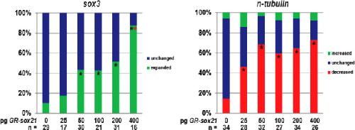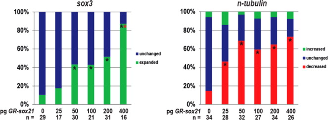 Fig. 6. Sox21 affects neural gene expression in a dose-dependent manner. Embryos were injected with the indicated amounts of GR-sox21 mRNA and analyzed by ISH for changes in sox3 and n-tubulin expression. Graphs are data from a single representative experiment, which was performed three times and displayed the same trend. n=total number of injected embryos analyzed in one experiment. â Indicates significance by Chi-square test (p<0.05) compared to uninjected (0 pg) alone. indicates significance by Chi-square test (p<0.05) compared to other doses (25â200 pg).