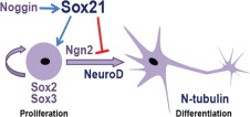Fig. 7. Model for function of Sox21 during neurogenesis. Sox21 is induced by Noggin and maintains cells in a progenitor state by binding to Ngn2 to inhibit neuronal differentiation and expand the expression of the soxB1 genes when expressed at a high level.