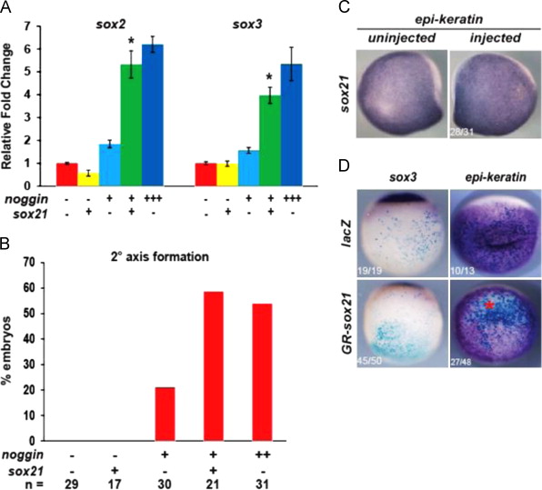 Fig. 2. Sox21 facilitates neural progenitor induction by Noggin. (A) Quantitative RT-PCR analysis of sox2 and sox3 expression in neurula stage ectodermal explants isolated from embryos injected with low (+) or high (+++) levels of noggin mRNA with or without sox21 mRNA at the 1-cell stage. â indicates significance by Student׳s t-test (p<0.05) compared to both sox21 and low noggin alone. (B) Graph of secondary axis phenotype for embryos injected with low (+) or high (++) nogginA3 mRNA with or without sox21 into one ventralblastomere, and analyzed by ISH for sox3. (C) ISH of a single neurula stage embryo injected with sox21 mRNA and analyzed for epi-keratin expression. (D) ISH of embryos injected into one ventralblastomere with hormone-inducible GR-sox21 mRNA, and analyzed for sox3 or epi-keratin expression. â indicates reduced expression.