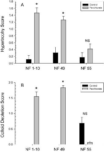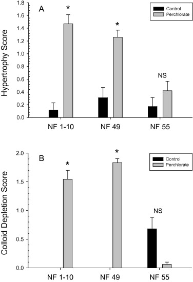 Thyroid follicle cell hypertrophy (A) and colloid depletion scores (B) in X. laevis tadpoles exposed to untreated FETAX medium (control) or 14 mg ClO4−/L beginning at Nieuwkoop–Faber (NF) stages 1–10, 49, or 55. Bars represent the mean + S.E.M. of 5–10 animals per group. Asterisks indicate significant difference (p < 0.05) between ClO4− and controls based upon nonparametric t-test.