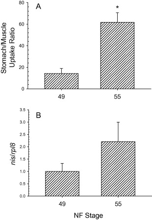 Changes in NIS activity (A) and mRNA abundance (B) between Nieuwkoop–Faber (NF) stages 49 and 55. (A) Radioactivity in stomach of stage 49 and NF 55 tadpoles injected with 125I (1 μCi). Radioactivity in stomach was expressed as a ratio of radioactivity in skeletal muscle, a non epithelial and non-I− transporting tissue. (B) Change in nis mRNA abundance relative to rpl8 between NF 49 and 55. Asterisk indicates significant difference from control based upon Student’s two-tailed t-test.