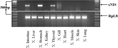 2% agarose gels showing RT-PCR analysis of nis mRNA in various tissues of NieuwkoopâFaber stage 58 X. laevis. Two micrograms of total RNA from each tissue were reversed transcribed before PCR amplification and separation on a 2% gel. Relative expression of the ribosomal protein L8 (RPL8) is shown as a housekeeping control for the integrity of the total RNA. Primer sequences based upon Carr et al. (2008).