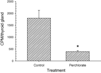 Radioactivity (cpm) in thyroid glands of Nieuwkoop–Faber (NF) stage 58 tadpoles injected with 125I (1 μCi) with or without the addition of 1 mg ClO4−/g. Bars represent the mean + S.E.M. of 5–6 animals per group. Asterisk indicates significant difference from control based upon Student’s two-tailed t-test.