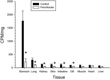Radioactivity (cpm) in various non-thyroidal tissues of Nieuwkoop–Faber (NF) stage 58 tadpoles injected with 125I (1 μCi) with or without the addition of 1 mg ClO4−/g. Bars represent the mean + S.E.M. of 5–6 animals per group. Asterisk indicates significant difference from control based upon Student’s two-tailed t-test.