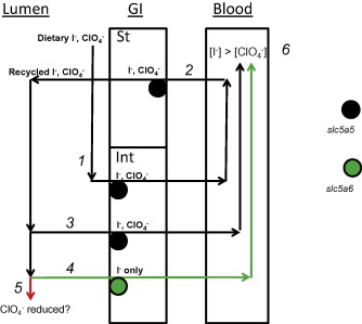 Our ‘recirculating pump’ hypothesis for how developmental increases in gastric I− transport can elevate I−/ClO4− ratios in the blood supply and thereby reduce ClO4− competition for NIS transporters in thyroid follicle cells. (1) Dietary I− and ClO4− are absorbed via NIS located in the apical plasma membrane of absorptive cells in the small intestine (Nicola et al., 2009). (2) Dietary I− and ClO4− in the bloodstream are secreted into the gastric lumen via NIS located in the basolateral plasma membrane of surface epithelial cells in the stomach (Portulano et al., 2014). (3, 4) Recycled I− and ClO4− are again reabsorbed across the intestinal lining whereas I− only is reabsorbed by the ClO4− insensitive biotin transporter SLC5A6 (Delmondes de Carvalho and Quick, 2011). (5) After several re-circulating cycles ClO4− may be subject to biological reduction by enteric bacteria. (6) The combined effects of I− recirculation and conservation, biological ClO4− reduction in the gut lumen, and ClO4− insensitive absorption by the small intestine may lead to quicker elevation in the I−: ClO4− ratio in the blood stream and thus mitigate the adverse effects of ClO4− on thyroid follicle cells.