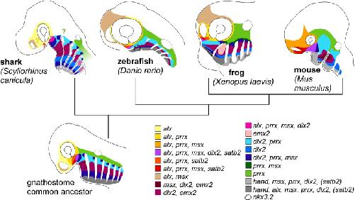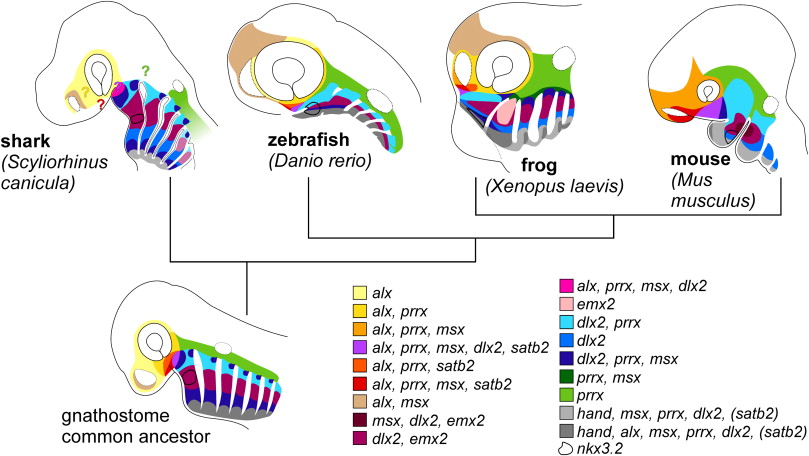Fig. 4. Expression maps of larval gnathostome head skeletons. Combinatorial transcription factor expressions mapped to the head of a representative shark (Scyliorhinus canicula), ray-finned fish (zebrafish; Danio rerio), frog (Xenopus laevis), and mouse (Mus musculus). All schemes are depicted with anterior to left. Data for the shark, fish, and mouse were taken from current literature (see main text for citations); these maps represent our interpretation of published expression data. Extrapolating from these four organisms, we have reconstructed a hypothetical expression map for the gnathostome common ancestor. nkx3.2 expression in PA1 is uniquely indicated by a black outline. Colored question marks on the shark indicate our prediction of correspondingly colored expression domains which may be present in the shark head. satb2 in parentheses indicates a lack of this data in shark only (in both light and dark grey domains). pou3f3, gsc, and tbx2/3 were excluded from this map for simplicity.