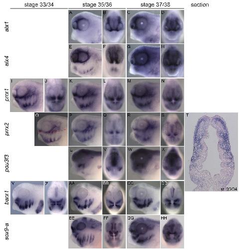 Expression of alx1, alx4, prrx1, prrx2, pou3f3, barx1, and sox9-a. Gene and stage are indicated in figure. Anterior to left in all lateral views. Red line in (O) shows plane of section in (T).
