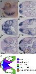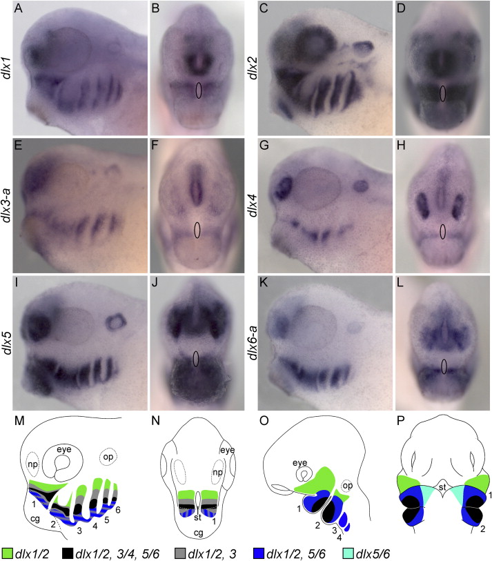 Fig. 1. dlx Expression in X. laevis at st. 33/34. Lateral views with anterior to left (A, C, E, G, I and K) and anterior views (B, D, F, H, J and L) of larvae stained by ISH for (A and B) dlx1, (C and D) dlx2, (E and F) dlx3-a, (G and H) dlx4, (I and J) dlx5, and (K and L) dlx6-a. The position of the stomodeum is indicated by an oval in all anterior views. (MâP) Schematic of dlx expression in the X. laevis (M and N) and mouse (O and P) cranial neural crest cells. See figure for key. Lateral views in (M) and (O), anterior views in (N) and (P). For X. laevis, the ventral blue domain is shown with grey stripes to indicate the expression of dlx3 in this region weakly. For mouse, data were used from both Jeong et al., 2008 and Depew et al., 2002. cg, cement gland; np, nasal placode; op, otic placode; st, stomodeum. Each PA is labeled by number.