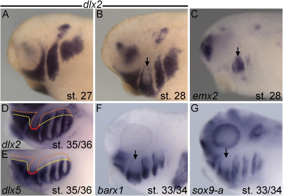 Fig. 5. Unique gene expression in the X. laevis PA2. All larvae are shown in lateral view with anterior to left. (A and B) dlx2 is expressed throughout migratory PA CNCCs at (A) st. 27, but at (B) st. 28 it becomes sharply downregulated in the dorsal PA2 (the future columella; arrow in B). (C) Coinciding with dlx2 down-regulation, emx2 is expressed at st. 28 in the dorsal PA2 (arrow). At st. 35/36, (D) dlx2 and (E) dlx5 uniquely share part of their dorsal boundary in PA2. Orange and yellow dotted lines show the boundary of dlx2 and dlx5, respectively, while the red solid line indicates their shared border. (F) barx1, and (G) sox9-a also display conspicuous down-regulation in the dorsal PA2 at st. 33/34 (arrows in F and G).