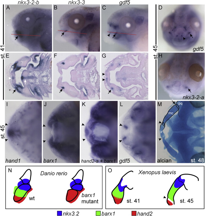 Fig. 6. Gene expression in the intramandibular and primary jaw joint. Lateral views (AâC), dorsal views (IâM), and sections (EâG) are all shown with anterior to the left. Anterior views in (D and H). All black arrows mark the primary jaw joint, and all black arrowheads mark the intramandibular joint. (AâC) lateral views of whole-mount ISH for (A) nkx3-2-b, (B) nkx3-3, and (C) gdf5 at st. 41. Red lines depict the plane of section in the corresponding panel below each whole-mount photo, black arrows mark the future primary jaw joint, and the black arrowhead marks the future intramandibular joint. (D) Anterior view of whole-mount ISH for gdf5 at st. 45. (EâG) Sections of st. 41 larvae showing expressions in the future intramandibular and primary jaw joints. (E) nkx3-2-b is expressed in a broad domain surrounding the nascent primary jaw joint (black arrow), and also medially in the future infrarostral (white arrowhead) and future basihyal (white arrow). (F) nkx3-3 expression is found in the primary jaw joint (black arrow). (G) gdf5 expression is found in the nascent intramandibular joints (black arrowheads), and primary jaw joint (black arrow). (H) st. 45 whole-mount ISH for nkx3-2-a, shows expression in the primary jaw joint (black arrow). (IâL) dorsal views of st. 45 whole-mount ISH showing mandibular expression of (I) hand1, (J) barx1, (K) hand2-a+barx1 (double ISH; see Methods section), and (L) gdf5. Black arrowheads mark the future intramandibular joints. (M) Dorsal view with a ventral focal plane of a st. 48 X. laevis larva stained with alcian blue. Black arrowheads mark the intramandibular joints, black arrow marks the right primary jaw joint. (N and O) schematics of expressions showing hand2 (red), barx1 (green), and nkx3.2 (blue) in the mandibular arch. (N) wt and barx1 mutant zebrafish mandibular expression (adapted from Fig. 9B of Nichols et al., 2013). (O) st. 41 and st. 45 X. laevis mandible expression. The barx1 mutant zebrafish takes on a larval morphology strikingly similar to that of an anuran, with an extra joint forming within Meckelâs cartilage. Black arrowhead indicates the position of the future intramandibular joint. ir, infrarostral; mc, Meckelâs cartilage; pq, palatoquadrate.