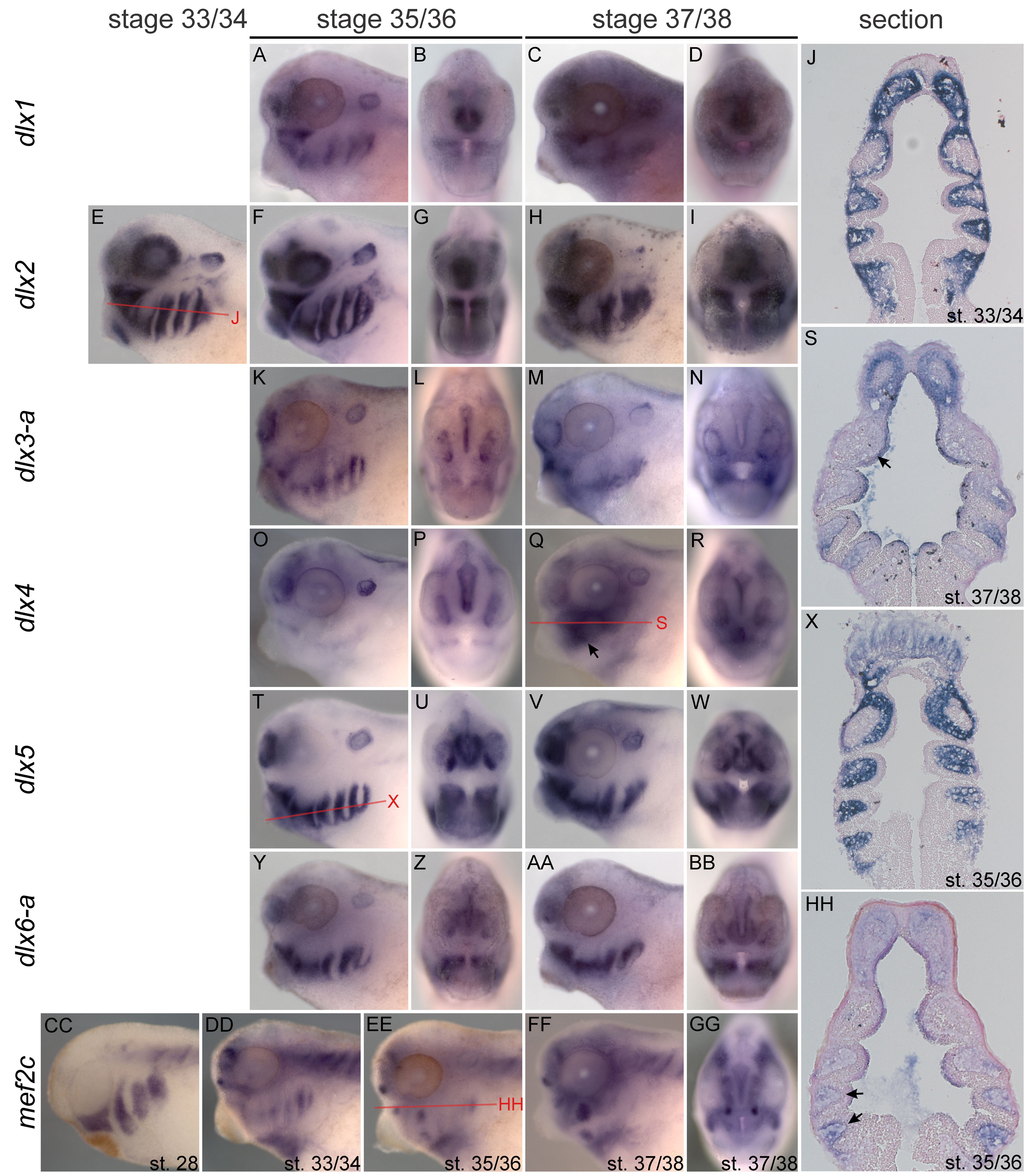 Expression of dlx genes and mef2c. Gene and stage are indicated in figure. Anterior to left in all lateral views, anterior to top in all sections. For those genes with a section shown, the plane of section is shown as a red line on the corresponding whole-mount panel. (Q) at stage 37/38, the dlx4 signal in the pharynx is mostly due to riboprobe trapping (arrows in Q and S), though some expression in the posterior arch CNCCs remains. (HH) expression of mef2c is detected in pharyngeal CNCCs (arrows).