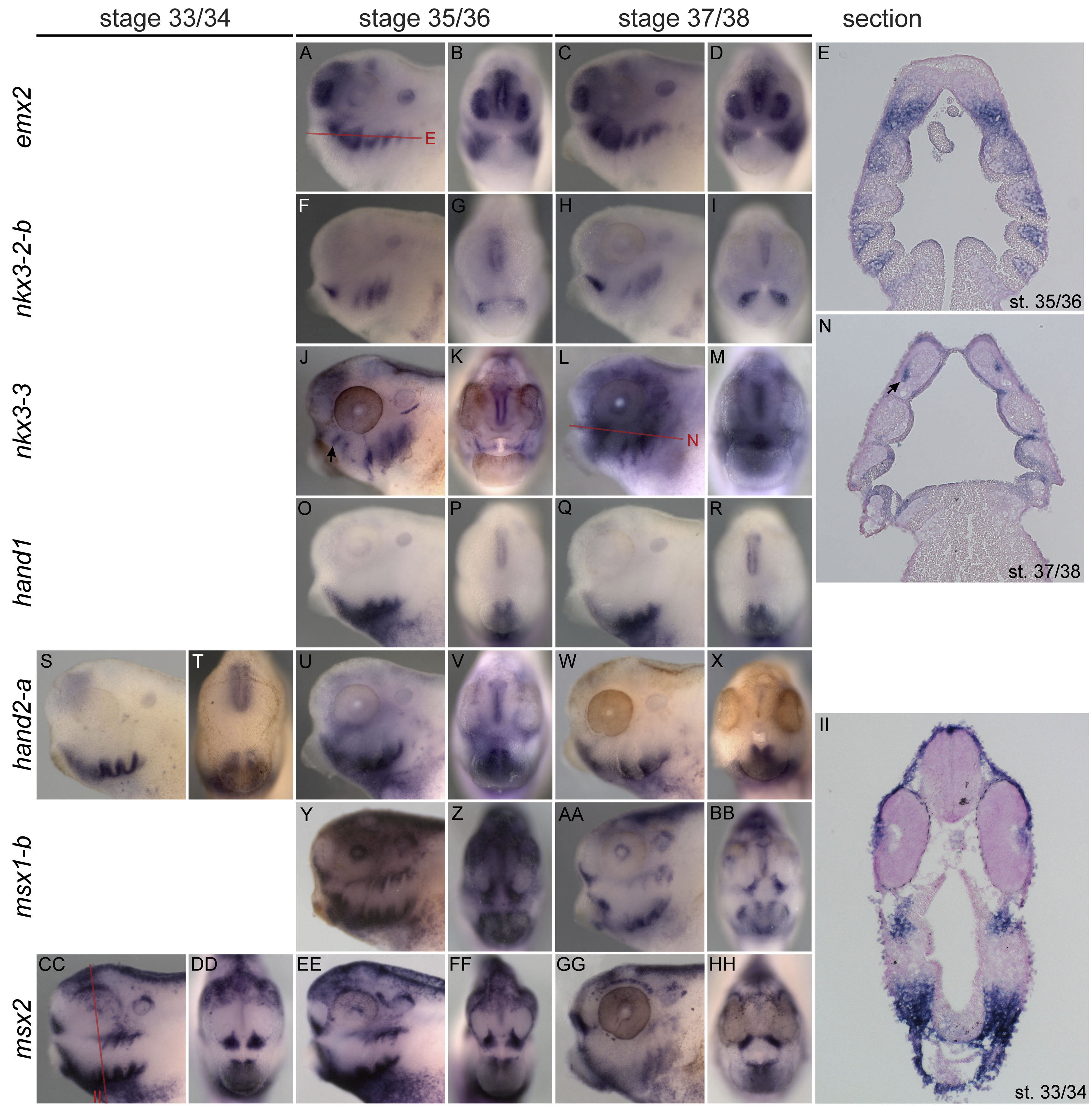 Expression of emx2, nkx3-2-b, nkx3-3, hand1, hand2-a msx1-b, and msx2. Gene and stage are indicated in figure. Anterior to left in all lateral views, anterior to top in E, N, dorsal to top in II. For those genes with a section shown, the plane of section is shown as a red line on the corresponding whole-mount panel. (J and N) nkx3-3 is expressed in CNCCs where the primary jaw joint will eventually form (arrow).