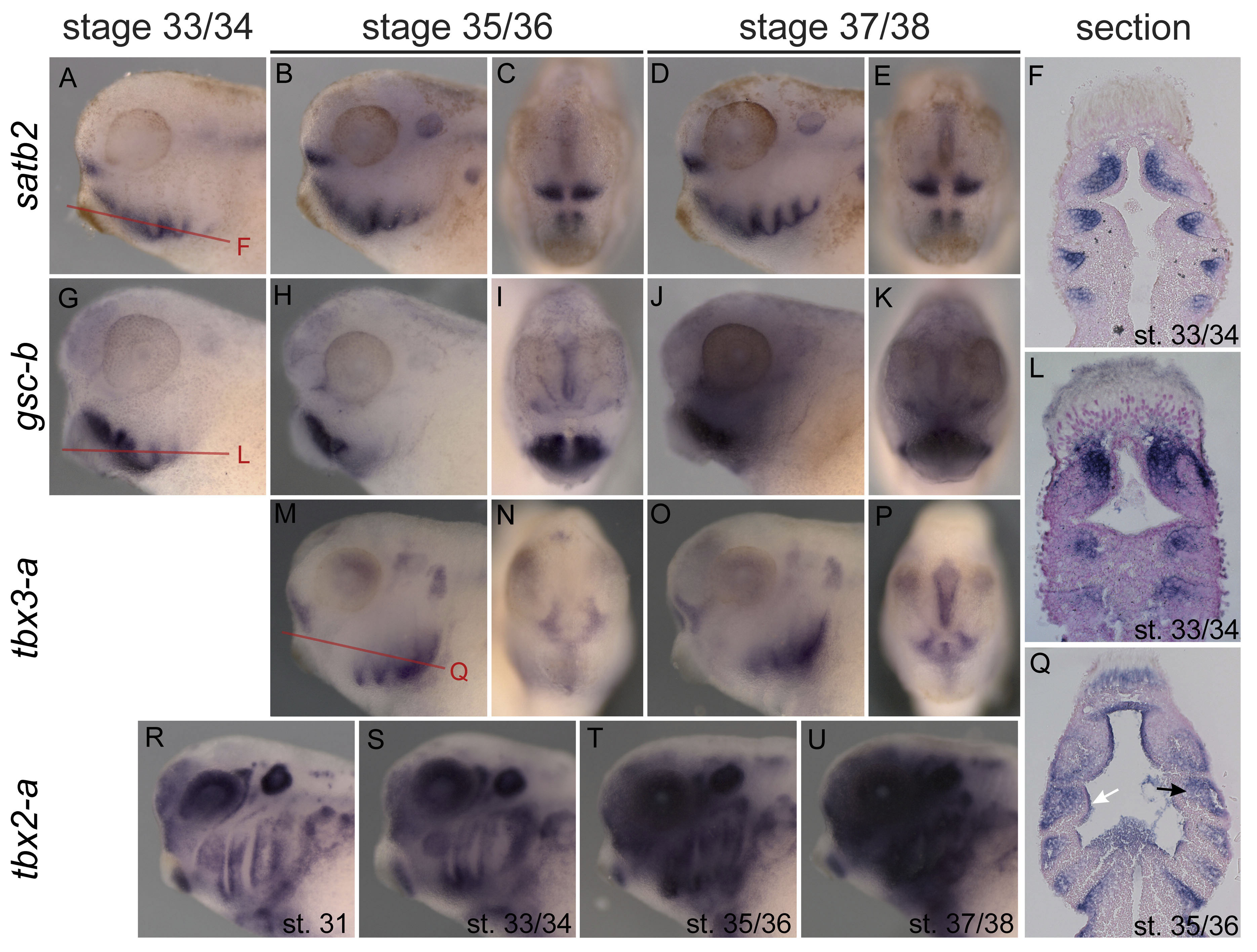 Expression of satb2, gsc-b, tbx3-a, and tbx2-a. Gene and stage are indicated in figure. Anterior to left in all lateral views, anterior to top in all sections. For those genes with a section shown, the plane of section is shown as a red line on the corresponding whole-mount panel. (Q) tbx3-a is expressed in both CNCCs (black arrow) and endoderm (white arrow) of the PAs.