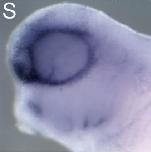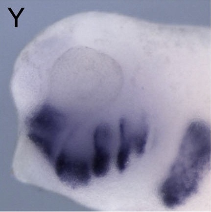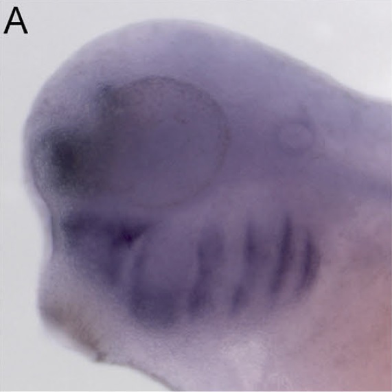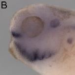 dlx4(distal-less homeobox 4) gene expression in Xenopus laevis embryo, assayed via in situ hybridization, NF stage 34, lateral view, anterior left, dorsal up.