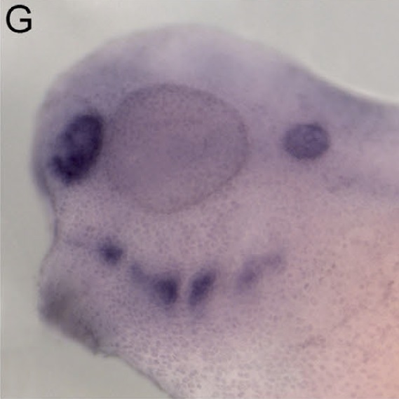 Fig. 3. Expression domains in the forming suprarostral plate, ethmoid plate, and trabecular cartilages at st. 37/38. Anterior to left in all panels. (A) Whole-mount lateral view of satb2 at st. 37/38; red line depicts the approximate plane of section used to assess gene expression in all subsequent panels. (B) satb2 is expressed dorsal to the PAs in the suprarostral plate at st. 37/38. (C) alx4 marks all aspects of the future neurocramium ventral to the eyes and brain. (D) prrx2 is found only in a lateral subset of the suprarostal plate, ethmoid plate, and trabeculae. (E) gsc-b is detected in the trabeculae and a small portion of the lateral ethmoid plate. (F) msx1-b is expressed strongly in the future suprarotal plate. (G) A summary scheme of the expressions shown in (B)â(F).
