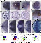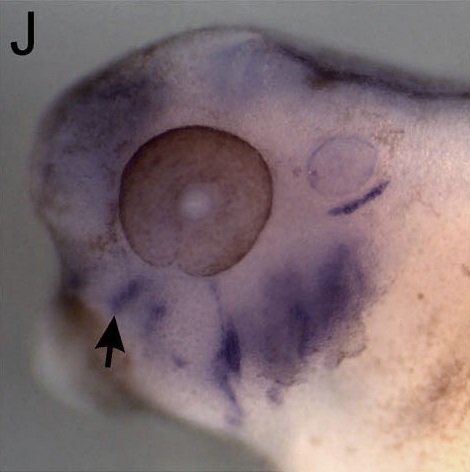 dlx1 (distal-less homeobox 1) gene expression in Xenopus laevis embryo, assayed via in situ hybridization, NF stage 34, lateral view, anterior left, dorsal up.