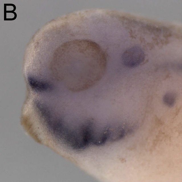 alx4 (ALX homeobox 4) gene expression in Xenopus laevis embryo, assayed via in situ hybridization, NF stage 34, lateral view, anterior left, dorsal up.