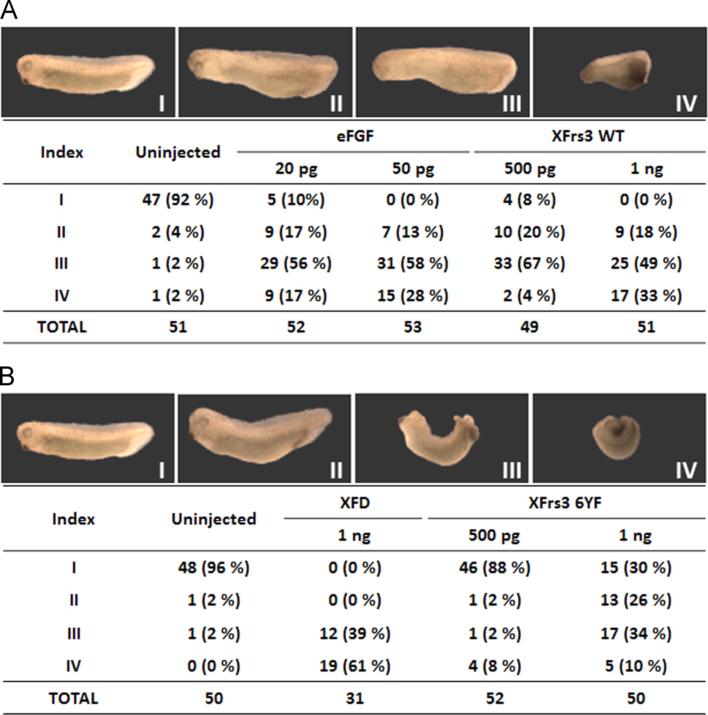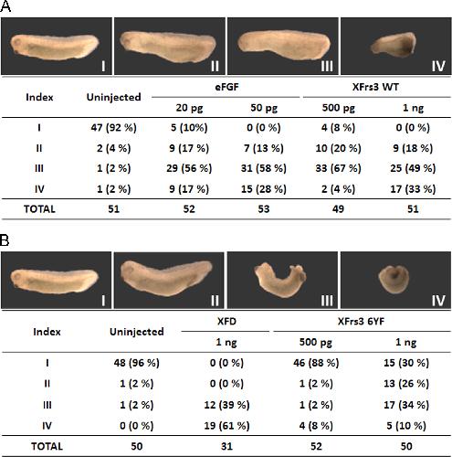 Fig. 3. Overexpression of wild type or mutant XFrs3 disrupts mesoderm patterning. Indicated amounts of mRNA (per embryo) were injected into equatorial region of 2-cell embryos, and the embryos are scored for phenotypes at stage 33/34. XFrs3 WT, wild type XFrs3; XFrs3-6YF, mutant XFrs3 with Tyr to Phe substitution for all 6 putative tyrosine phosphorylation sites; XFD, dominant negative mutant form of XFGFR1. Anterior is to the left. In the tables, numbers and numbers in parentheses respectively indicate the number of embryos and the percentage of embryos showing particular defect. (A) Indexes I-IV represent the degrees of anterior defects: normal (I) to most severe anterior defects (IV). (B) Indexes I-IV represent the degrees of posterior defects: normal (I) to most severe posterior defects (IV).