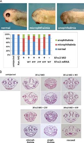 Fig. 7. The putative Shp2-binding sites, but not the putative Grb2-binding sites, are important for XFrs3 function during eye development. Indicated combinations of XFrs3 MO or random (Ran.) MO (7.5 pmole each/embryo) along with wild type (WT) or mutant (4YF, 2YF, or 6YF) XFrs3 mRNA (50 pg each/embryo) were injected into equatorial region of 2-cell embryos. (A) Embryos are scored for phenotypes at stage 38. The percentages of embryos with microphthalmia or anophthalmia are tabulated in the bottom panel. Injections were carried out with 3 separate batches of embryos. (B) Embryos, scored for particular phenotypes in panel A, were sectioned at the level of eyes and stained with hematoxylin/eosin.