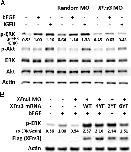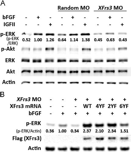 Fig. 8. XFrs3 is important for FGF or IGF-induced phosphorylation of ERK. Indicated combinations of XFrs3 or random MO (7.5 pmole each/embryo) along with wild type (WT) or mutant (4YF, 2YF, or 6YF) XFrs3 mRNA (50 pg each/embryo) were injected into animal region of 2-cell embryos. Animal caps were explanted at stage 8.5, treated with recombinant basic FGF (bFGF) (50 ng/mL) or IGFII (40 ng/mL) protein, and then harvested when sibling embryos reached stage 10. Activation of ERK (p-ERK) and Akt (p-Akt) are analyzed by immunoblotting. Actin is used as a loading control. For panel A, the total protein levels of ERK and Akt are also compared. For panel B, levels of XFrs3 proteins are compared by anti-Flag immunoblotting [Flag (XFrs3)]. (A) The numbers below p-ERK immunoblot (p-ERK/ERK) indicate relative intensities of p-ERK bands after normalization with corresponding ERK bands. The intensity of p-ERK band in MO non-injected and bFGF-treated sample is considered as 1. The intensities of p-ERK and ERK bands were measured by densitometry. (B) The numbers below p-ERK immunoblot (p-ERK/Actin) indicate relative intensities of p-ERK bands after normalization with corresponding Actin bands. The intensity of p-ERK band in MO/mRNA non-injected and bFGF-treated sample is considered as 1.