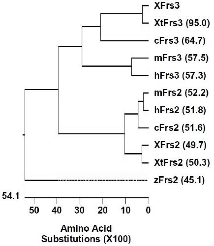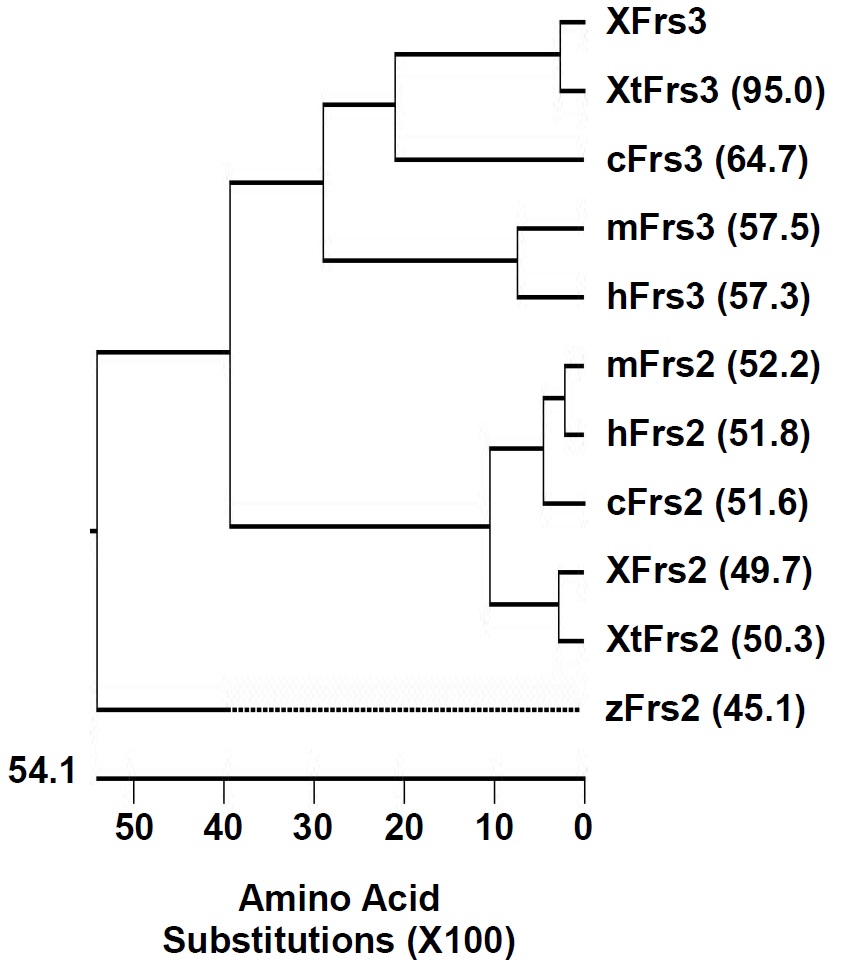 Supplement Fig. 2. Phylogenetic tree of vertebrate Frs homologs based on amino acid sequences: Xenopus laevis (X), Xenopus tropicalis (Xt), human (h), mouse (m), chick (c), and zebrafish (z). Numbers in parentheses are percentage identity with XFrs3.