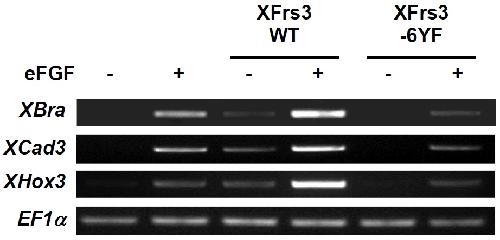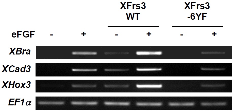 Supplement Fig. 3. XFrs3 induces and enhances FGF-induced expression of mesoderm markers. eFGF mRNA (20 pg/embryo) was injected along with indicated combinations of wild type or mutant XFrs3 mRNA (1 ng each/embryos) to animal region of 2-cell embryos. Animal cap cells were explanted at stage 8 and harvested at stage 10. The expression of mesoderm markers XBra, XCad3 and XHox3 is examined by RT-PCR. EF1alpha is used as a loading control.