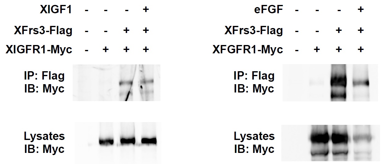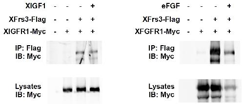 Supplement Fig. 4. XFrs3 interacts with XFGFR1 and XIGFR1. 293 cells were transfected for indicated combinations of XFrs3-Flag, XIGFR1-Myc, XFGFR1-Myc, XIGF1 and eFGF. The interaction of XFrs3 with XIGFR1 or XFGFR1 is examined by immunoprecipitation for XFrs3 using anti-Flag antibody (IP: Flag) followed by immunoblotting for XIGFR1 or