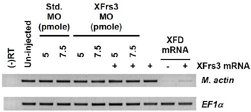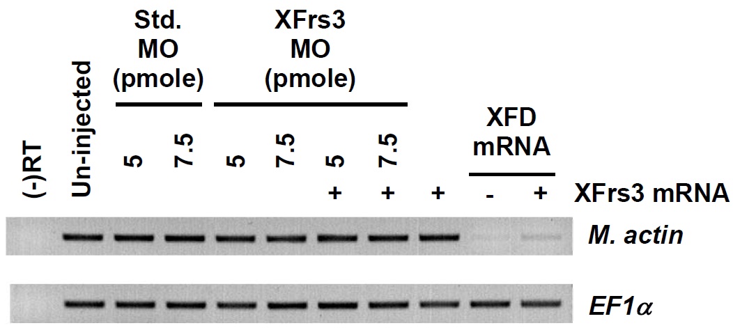 (25 pg/embryo) and XFD mRNA (1 ng/embryo) were injected to equatorial regions of 2-cellembryos. The expression of a mesoderm marker muscle actin (M. actin) is examined from stage 20 embryos by RT-PCR. EF1ï¡ is used as a loading control. For the negative control of RTPCR