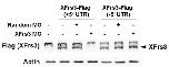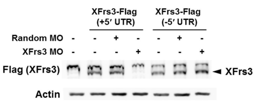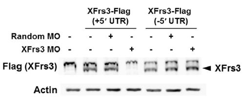 Supplement Fig. 6. Specificity of XFrs3 MO. 2-cell embryos were injected to equatorial region with indicated combinations of XFrs3-Flag mRNA with (+5' UTR) or without (-5' UTR) XFrs3 5' UTR (50 pg/embryo), and random or XFrs3 MO (7.5 pmole/embryo). Embryos were harvested at stage 10, and the expression levels of XFrs3-Flag are compared by anti-Flag immunoblotting [Flag (XFrs3)]. XFrs3 MO specifically inhibited the translation of XFrs3-Flag from mRNA containing the 5'UTR. Actin is used as a loading control.