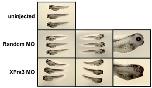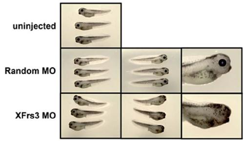 Supplement Fig. 7. XFrs3 MO inhibits eye development. XFrs3 or control random MO (7.5 pmole each/embryo) was injected into one dorsal blastomere at 4-cell stage, and the embryos are photographed at stage 40. The left most row shows uninjected side and the second row shows the injected side. The third row shows the injected side of representative embryo at higher magnification.