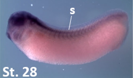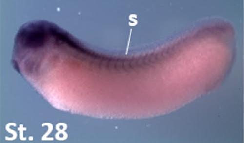 frs3 (fibroblast growth factor receptor substrate 3) gene expression in Xenopus laevis embryo, assayed via in situ hybridization, NF stage 28, lateral view, anterior left, dorsal up.