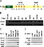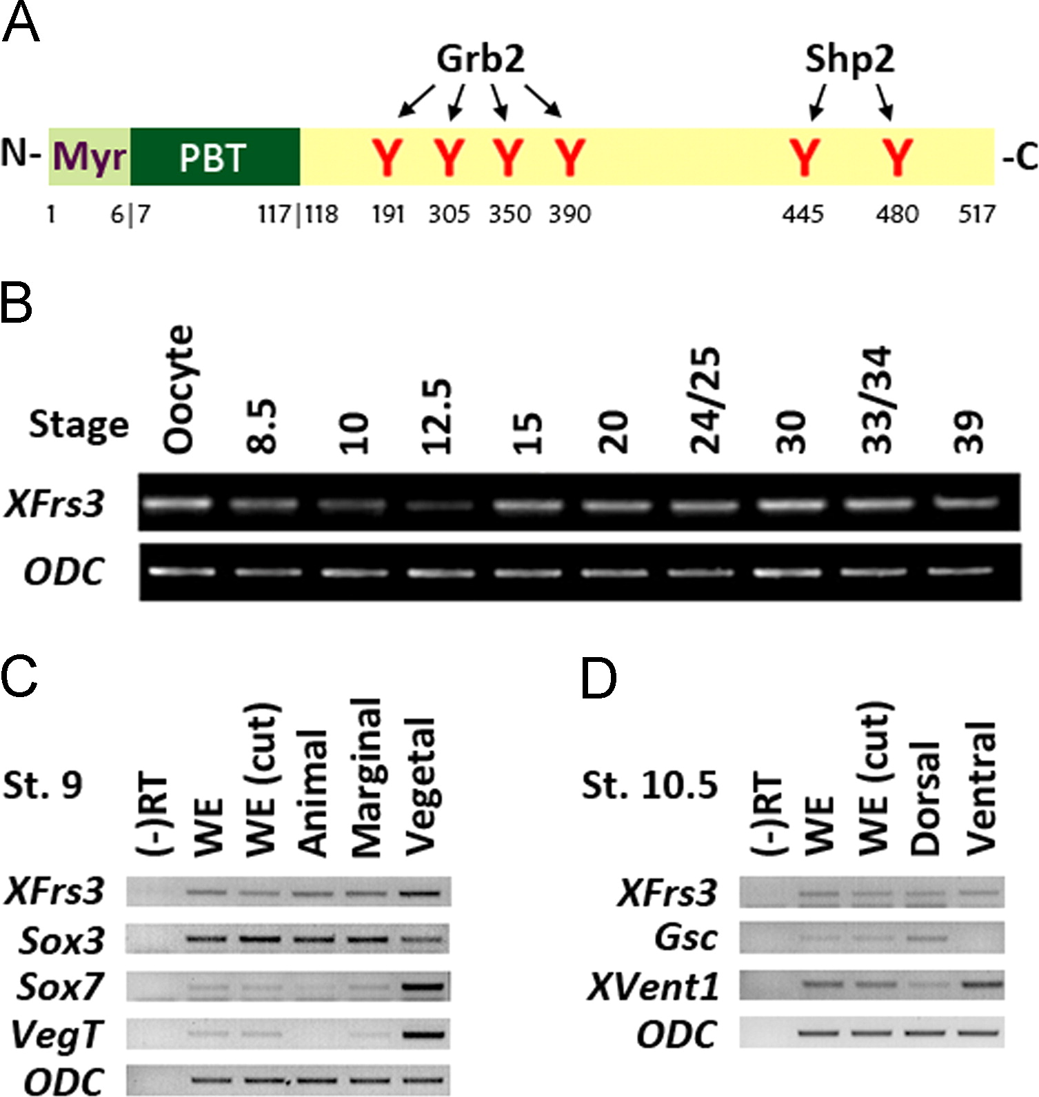 Temporal expression patterns of XFrs3. (A) Schematic representation of the domain structure of XFrs3. Six putative tyrosine phosphorylation sites (Y191, 305, 350, 398, 445, and 480) are marked in red. Myr, myristoylation sequence (MGSCCS, amino acids 1-6); PTB, phosphotyrosine binding domain (aa 7-117); Grb2, putative Grb2-binding sites; Shp2, putative Shp2-binding sites. (B) Levels of XFrs3 transcript are analyzed by RT-PCR using RNA isolated from whole embryos at indicated stages. ODC is used as a loading control. (C, D) Spatial expression patterns of XFrs3 in mid-blastula (C, stage 9) and early gastrula (D, stage 10.5) are analyzed by RT-PCR. Embryos were dissected to animal, marginal and vegetal regions at stage 9, or bisected to dorsal and ventral regions at stage 10.5. WE indicates RNA from whole embryos, and WE (cut) indicates RNA isolated with all dissected regions combined. Levels of marker gene mRNA for each region are examined to access the accuracy of dissection: Sox3, animal region marker; Sox7 and VegT, vegetal region markers; Gsc, dorsal marker; Xvent1, ventral marker. For the negative control of RT-PCR (âRT), RNA from whole embryos was processed as others without reverse transcriptase.