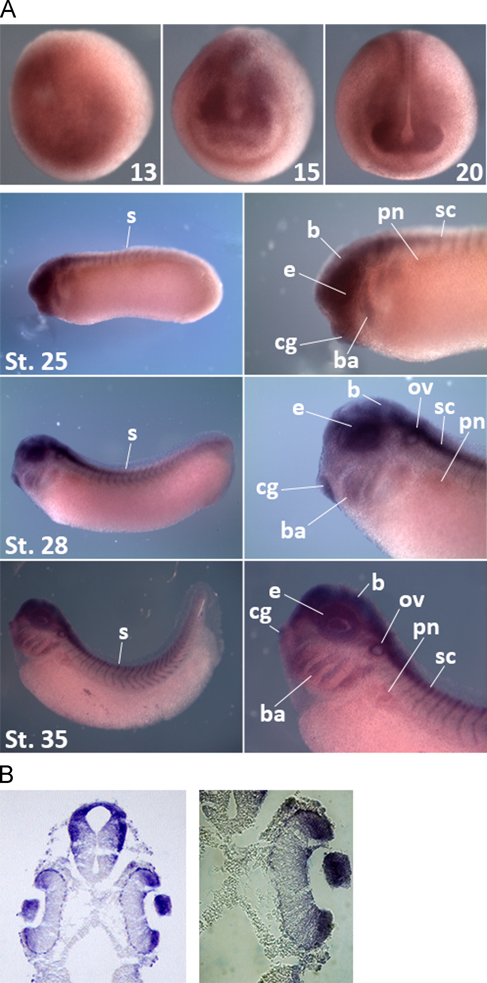 Fig. 2. Spatial expression patterns of XFrs3. (A) Whole-mount in situ hybridization of XFrs3. Embryos at indicated stages (13, 15, 20, 25, 28 and 35) were subjected to in situ hybridization with XFrs3 antisense probe. For stages 25, 28 and 35, right panels show magnified images of embryos at left panels. At early neurula stage (stage 13), XFrs3 is expressed broadly in the presumptive anterior neuroectoderm, and its expression is gradually localized to the eye field, cement gland and neural tube at mid-neurula and late neurula stages (stages 15 and 20). At early tailbud stages (stages 25 and 28) and tadpole stage (stage 35), XFrs3 transcript is localized in anterior structures of neuroectodermal origin [branchial arches (ba), cement gland (cg), eyes (e) and otic vesicles (ov)], brain (b), spinal cord (sc), somites (s) and pronephros (pn). (B) XFrs3 expression pattern in the eye at stage 35. Embryos at stages 35 were subjected to whole-mount in situ hybridization with XFrs3 antisense probe and then cross-sectioned. XFrs3 is expressed in the lens, the retina, and the brain.