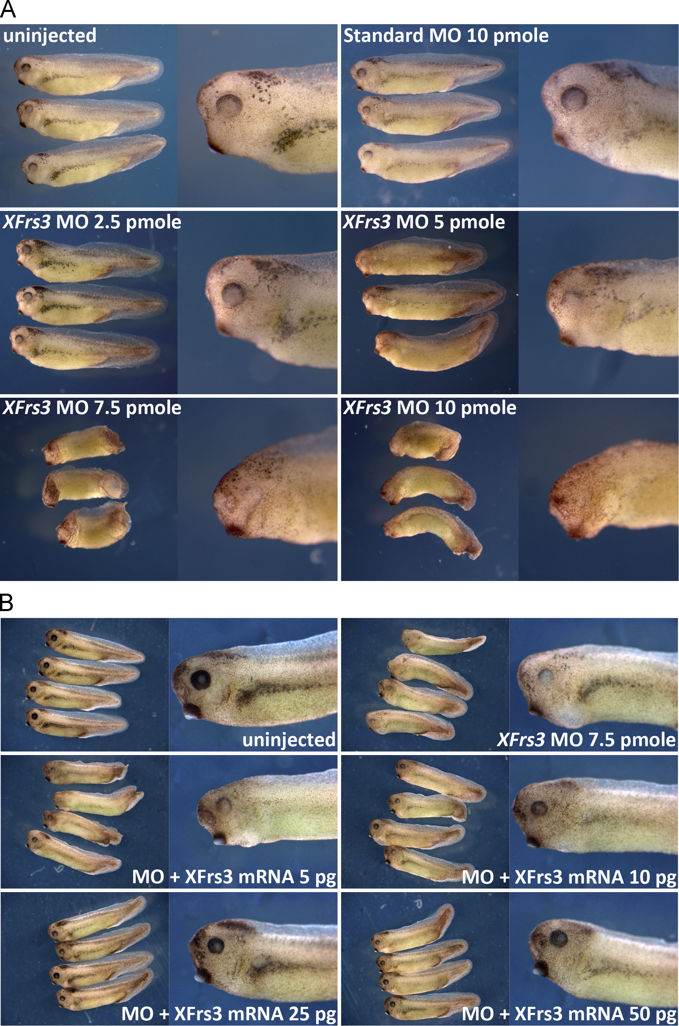 Fig. 4. Knockdown of XFrs3 causes defects in the eye and anterior structures. (A) Indicated amounts (per embryo) of XFrs3 MO or standard negative control MO were injected into equatorial region of 2-cell embryos, and the embryos are scored for phenotypes at stage 33/34. Representative embryos are also photographed at higher magnification to show defects in the eye. (B) Indicated combinations of XFrs3 MO (MO, 7.5 pmole/embryo) and XFrs3 mRNA (5â50 pg/embryo) were injected into equatorial region of 2-cell embryos, and the embryos are scored for phenotypes at stage 38.