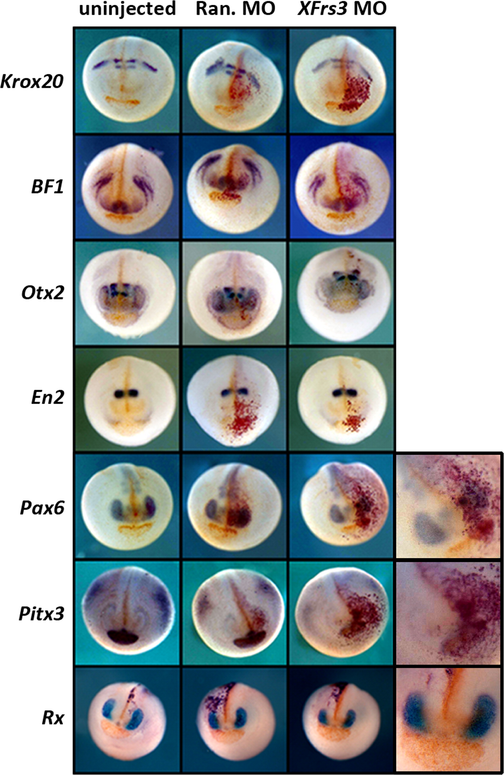 Fig. 5. Knockdown of XFrs3 reduces the expression of eye-specific marker Pax6 but not Rx at late neurula stage. XFrs3 MO or random negative control (Ran.) MO (7.5 pmole each/embryo) was injected along with nuclear β-galactosidase mRNA (250 pg/embryo) into one dorsal blastomere of 4-cell embryos. Embryos were fixed at stage 20, stained for β-galactosidase (red), and then subjected to whole-mount in situ hybridization with indicated antisense RNA probe. Embryos are viewed from anterior with dorsal sides towards the top. The right most panels for Pax6, Pitx3, and Rx are magnified images of embryos on the left. Injections were carried out with 4 separate batches of embryos, and 2 batched of embryos were pooled and randomly chosen for in situ hybridization analyses.