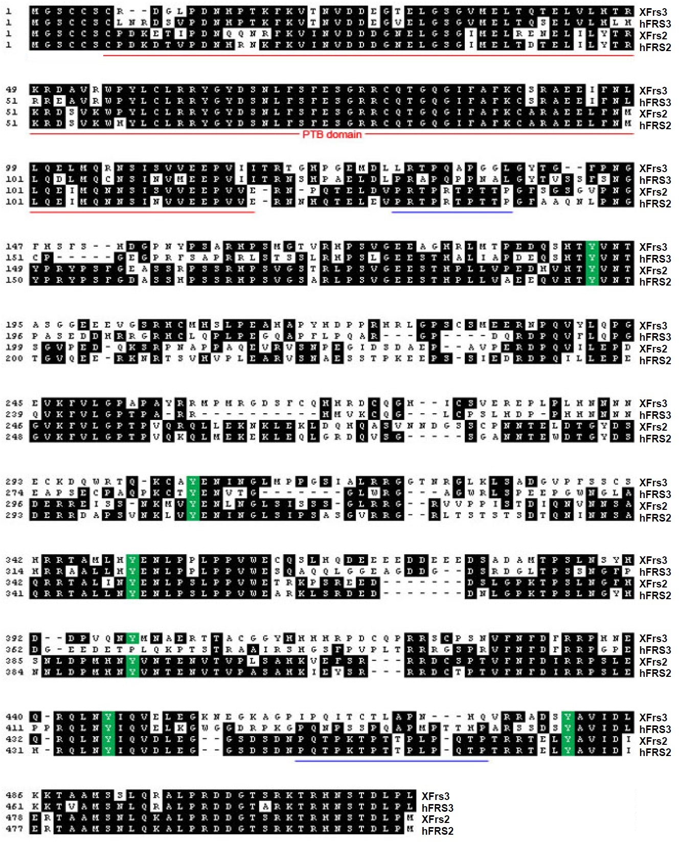 Frs proteins. Identical residues are boxed in black. The conserved PTB domains are underlined